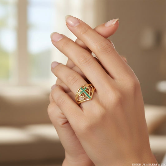 14K Gold Cross & Heart Ring – Green CZ Accent (Size 7)