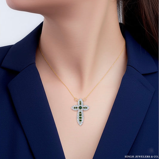14k Gold Cross Necklace – Diamonds & Emeralds, 18-Inch