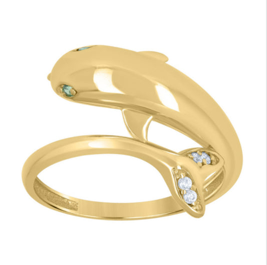 10k Yellow Gold Dolphin Ring – CZ Green & White Stones, Size 7