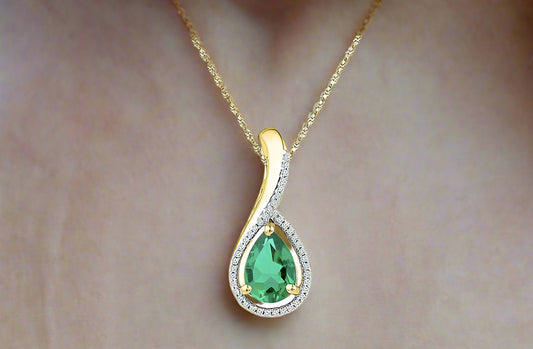 10k Yellow Gold Pear-Shaped Synthetic Emerald Solitaire Pendant with 1/12 Cttw Diamond – 2 Cttw Total Weight