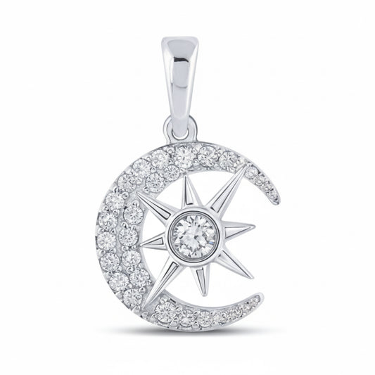 10K White Gold Diamond Crescent Moon and Star Pendant