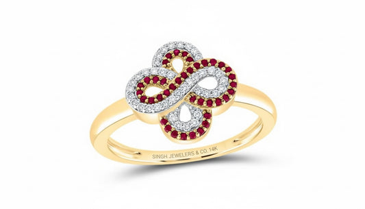 14k Yellow Gold Infinity Clover Ring with Diamonds & Ruby