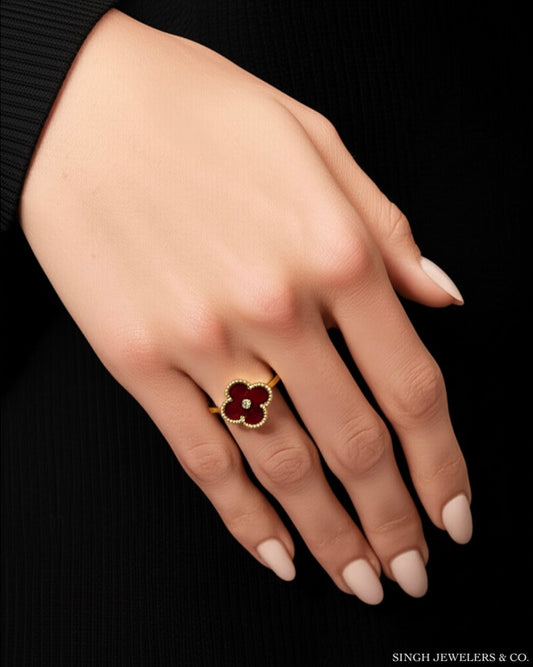 10K Gold Red Clover Vancleef Inspired Ring with Diamonds