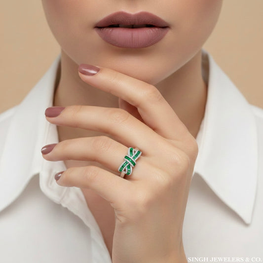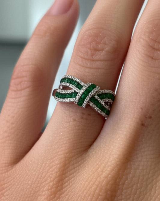 Sterling Silver Bow Ring with White Sapphires & Green Stones