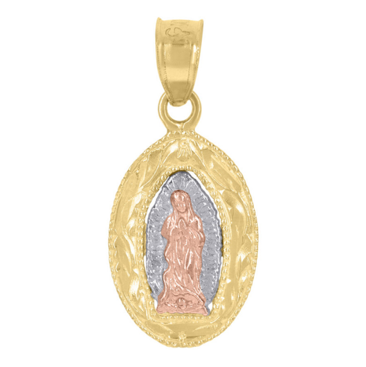The 10K Mary Religious Charm features a height of 20mm and a width of 9.2mm, crafted in a stunning tri-tone gold for a unique and eye-catching design. Expertly made with precision and quality in mind, this charm is sure to add a touch of elegance and beauty to any piece of jewelry.