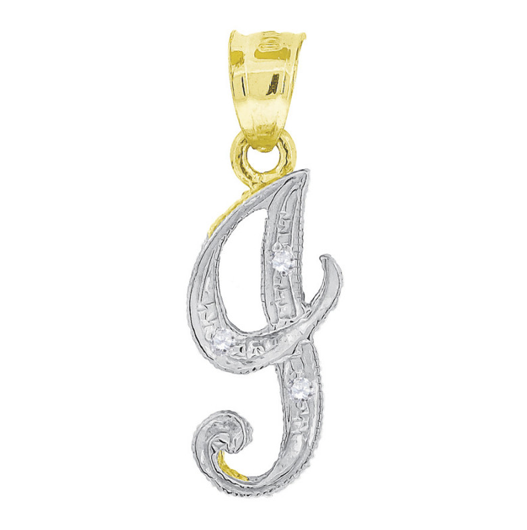 Crafted from gleaming 10K yellow gold, this stunning Two Tone "J" Initial Charm boasts a height of 23.5mm and a width of 7.7mm, creating a bold and eye-catching look. Perfect for adding a touch of personalized elegance to any outfit.White sapphires stones