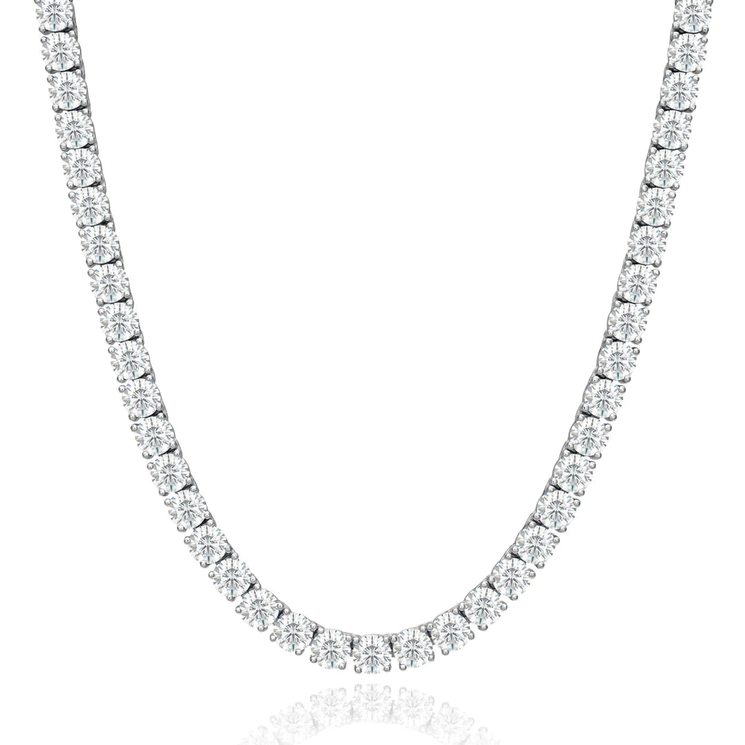 Total Moissanite Carat Weight: 36.30 CTW. This 20" Sterling Silver 4mm Tennis Chain is expertly designed and crafted for a sleek and stylish look. Its length is perfect for any occasion and adds a touch of elegance to any outfit.